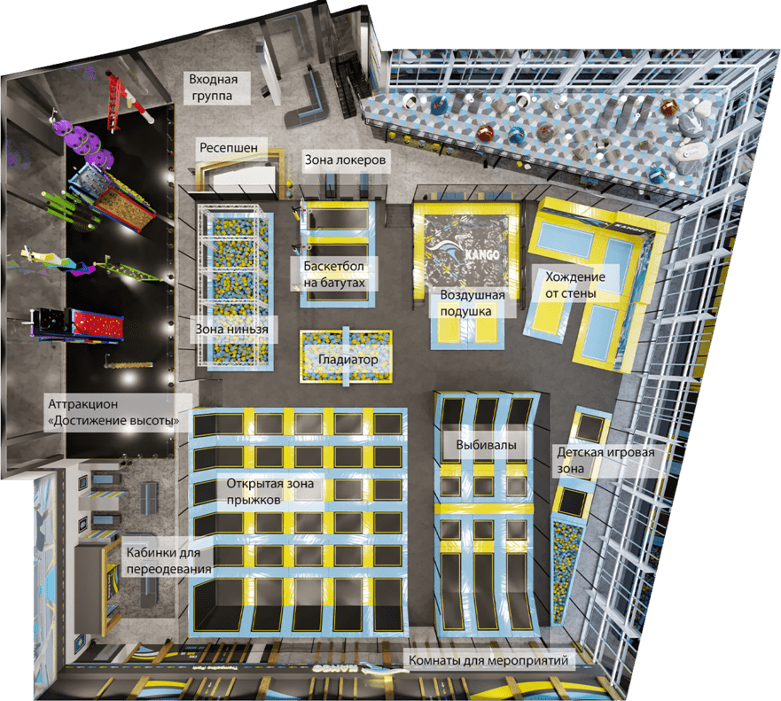 KANGO - батут саябағы ғана емес. Бұл барлық жастағы адамдар үшін белсенді ойын-сауық. Бізде сіз әртүрлі аттракциондарды таба аласыз-отбасыңызбен және достарыңызбен тәуелсіз және топтық секіруге арналған көптеген батуттар, трюктерді жаттықтыруға арналған ең үлкен ауа жастығы, тартылған итарқа бойымен жүре аласыз, гладиаторлық жекпе-жектерге қатыса аласыз және қарсыласыңызды доджбол командалық ойынында доппен ұра аласыз!